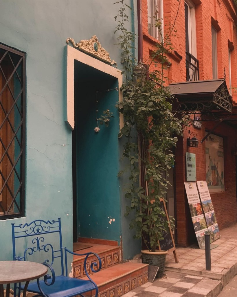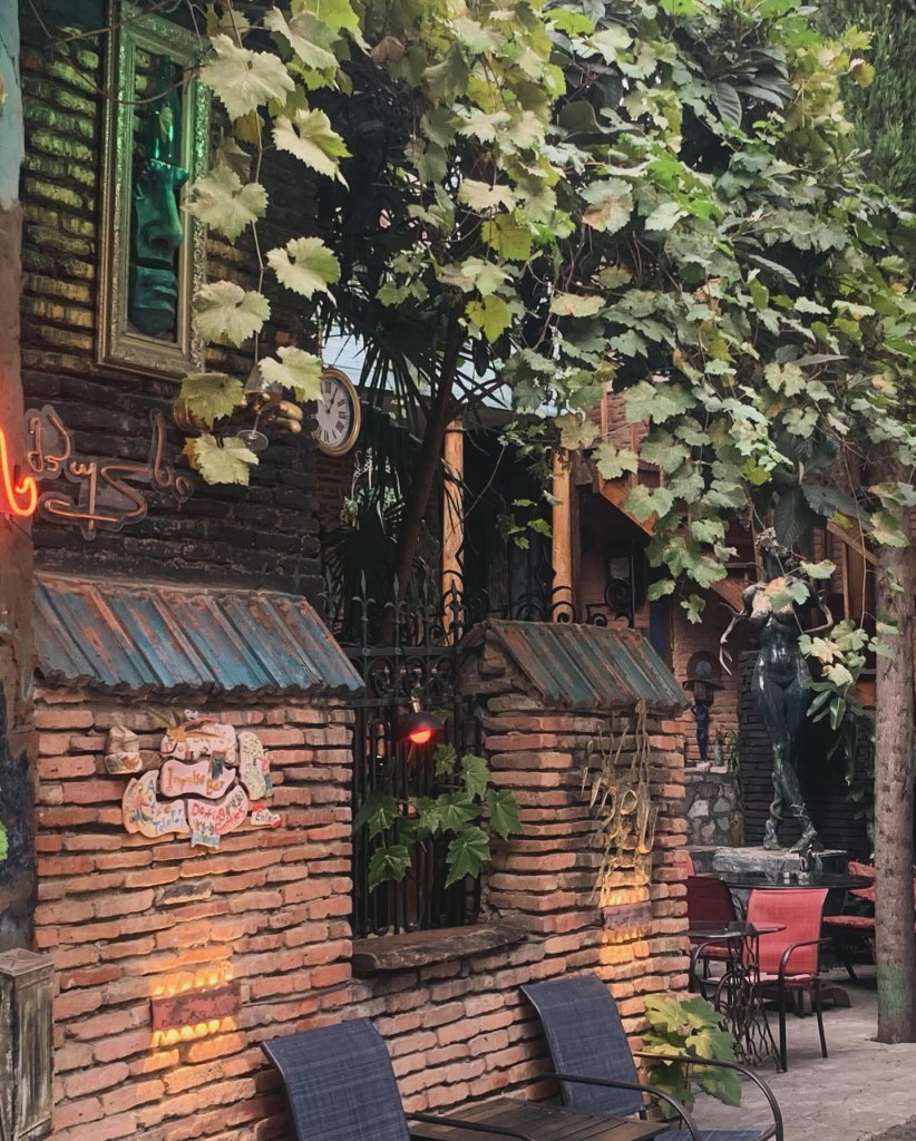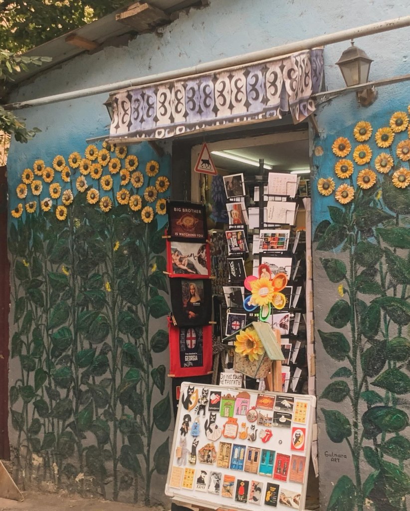 Али у свему томе родила се, као што рекох, једна грузијска панкерска култура, која је на грузијски начин изнедрила специфичну уметност. Видела сам лика који носи мајцу “Југославија”, млади пар са тетоважама који се клацка и љуља са својим дететом, видела сам старе сакое из “секондхенда” и момке који читају Чехова и Достојевског на степеницама велелепне зграде. Видела сам девојке које хеклају вунене чарапе и продају их туристима. Видела сам разне рукотворине од зихернадли и скупљених негде разних ситница које кроз руке постају украси. Слушали смо причу девојке која студира права и ради у кафићу викендом. У неком моменту су ушли неки руси на шта је она направила сцену чим су јој се обратили на руском…Вели она: “Нећу да причам са вама на руском”. Прилази нам и каже нам тихо: “Пазите, немојте и ви такође да причате са младима на руском”, а тражила сам јој “кофе с молоком…” пих.